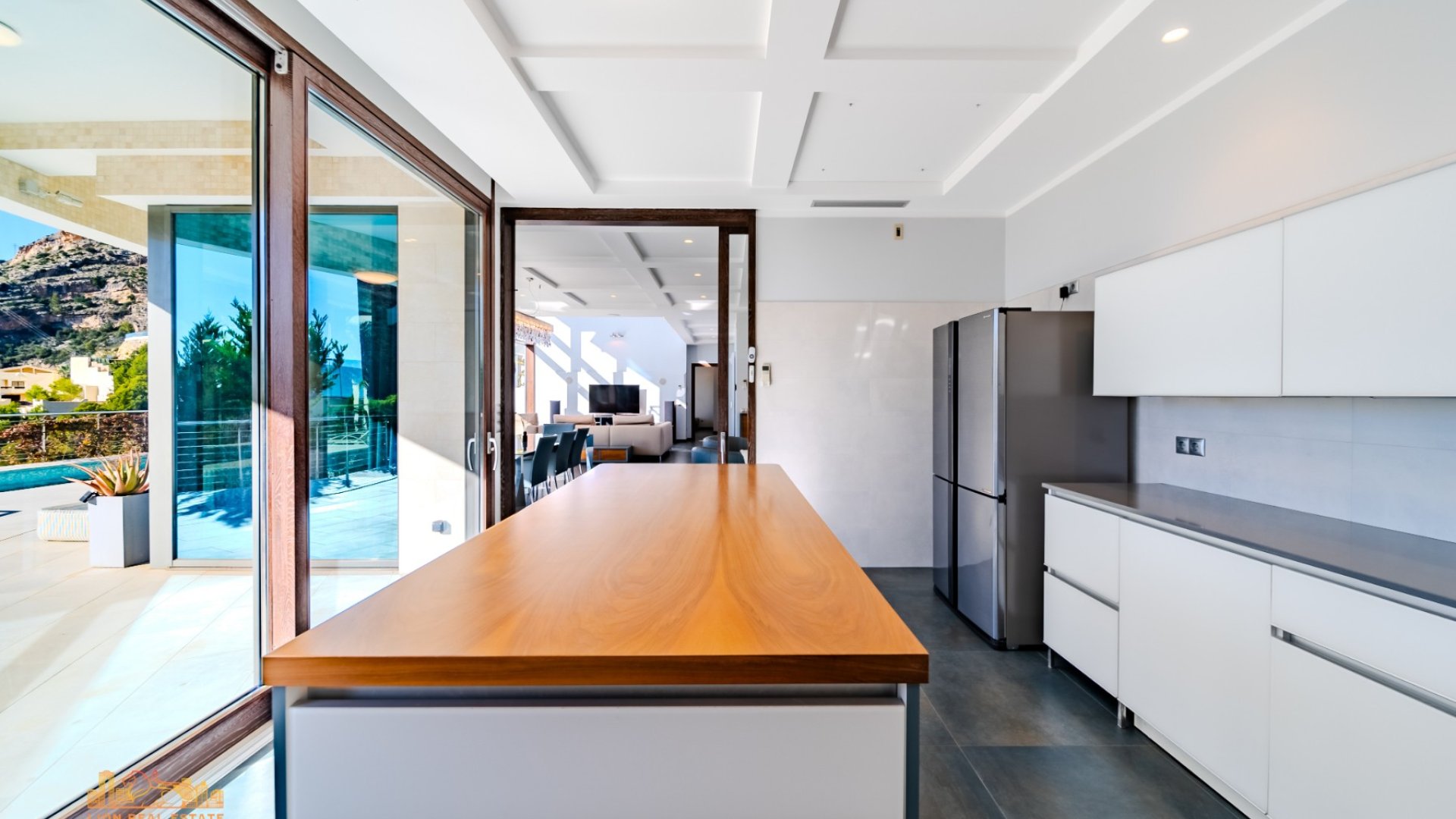 We present a luxurious three-story villa located in one of the most prestigious areas of the Costa Blanca: Altea Hills. Situated on a plot of 987 m², this property boasts a built area of 635 m² and terraces and balconies totaling 300 m², equipped with elegant stainless steel railings that enhance its modern design. One of the villa's main highlights is its stunning views of the sea and mountains, creating a serene and private atmosphere. The house includes 5 spacious bedrooms and 7 elegant bathrooms fitted with sanitary fixtures from top German brands like Villeroy, Duravit, and Bosch. The spacious living room with high ceilings, mirrored walls, and a fireplace is designed in a contemporary style. Luxury furniture by Rolf Benz completes the sophisticated ambiance. Sliding door systems add light and openness to the space. The villa offers various leisure areas, including a cinema, sauna, Turkish bath, jacuzzi, and a cozy relaxation room. The heated pool, measuring 16 m², features a protective cover, making it suitable for year-round use. The facade and fencing of the property are clad in light beige Kalisa natural stone, highlighting the elegant style of the property. The villa is equipped with modern technologies: an elevator, armored doors, an intercom system, alarm, and video surveillance for maximum security. Automation includes underfloor heating, an Aerotermia water supply system, automatic window ventilation, electric blinds, and curtains with an automatic mechanism. The garden is fitted with an irrigation system, and central air conditioning ensures a comfortable climate all year round. The villa's location is another highlight. Altea Hills is a gated residential community with 24/7 security. The Masymas supermarket is just a 5-minute walk away, and the prestigious Luis Campomanes marina, featuring restaurants and a yacht club, is a 7-minute walk. The city of Altea is only 5 kilometers away. Alicante Airport is a 45-minute drive, and Valencia is 1.5 hours away by car. This villa is perfect for those who value style, comfort, privacy, and top-notch infrastructure. The property meets the highest standards of luxury, offering everything needed for comfortable living and relaxation.