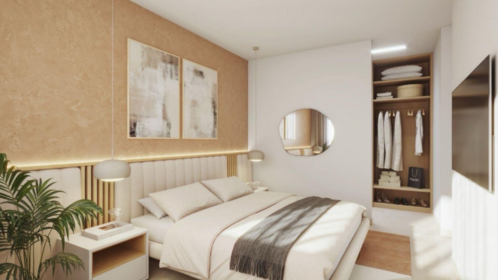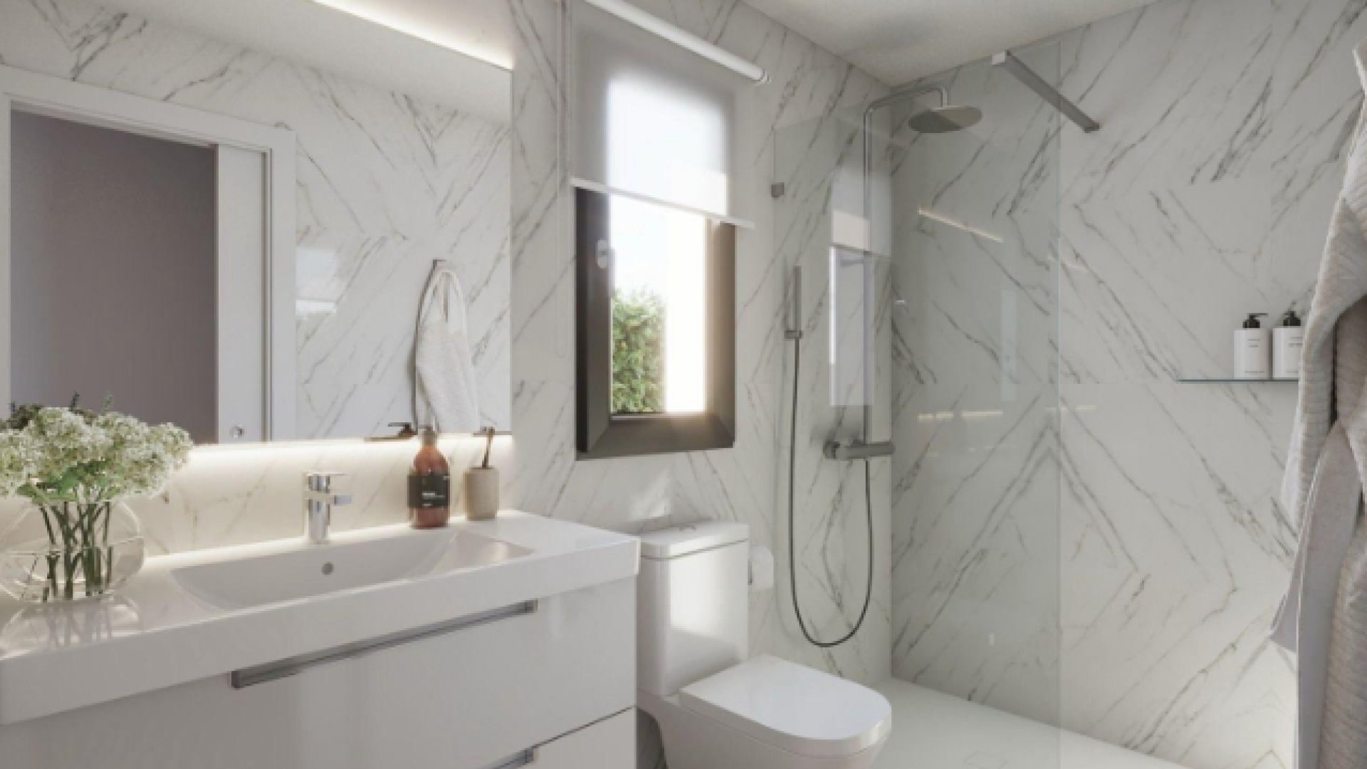 The villa has 3 double bedrooms, living room with kitchenette, and 2 bathrooms. The finishes are of high quality, with white lacquered interior carpentry, porcelain tile floors and exterior aluminum carpentry with double glazing. It also includes pre-installation of air conditioning and heating ducts, and fitted closets.
