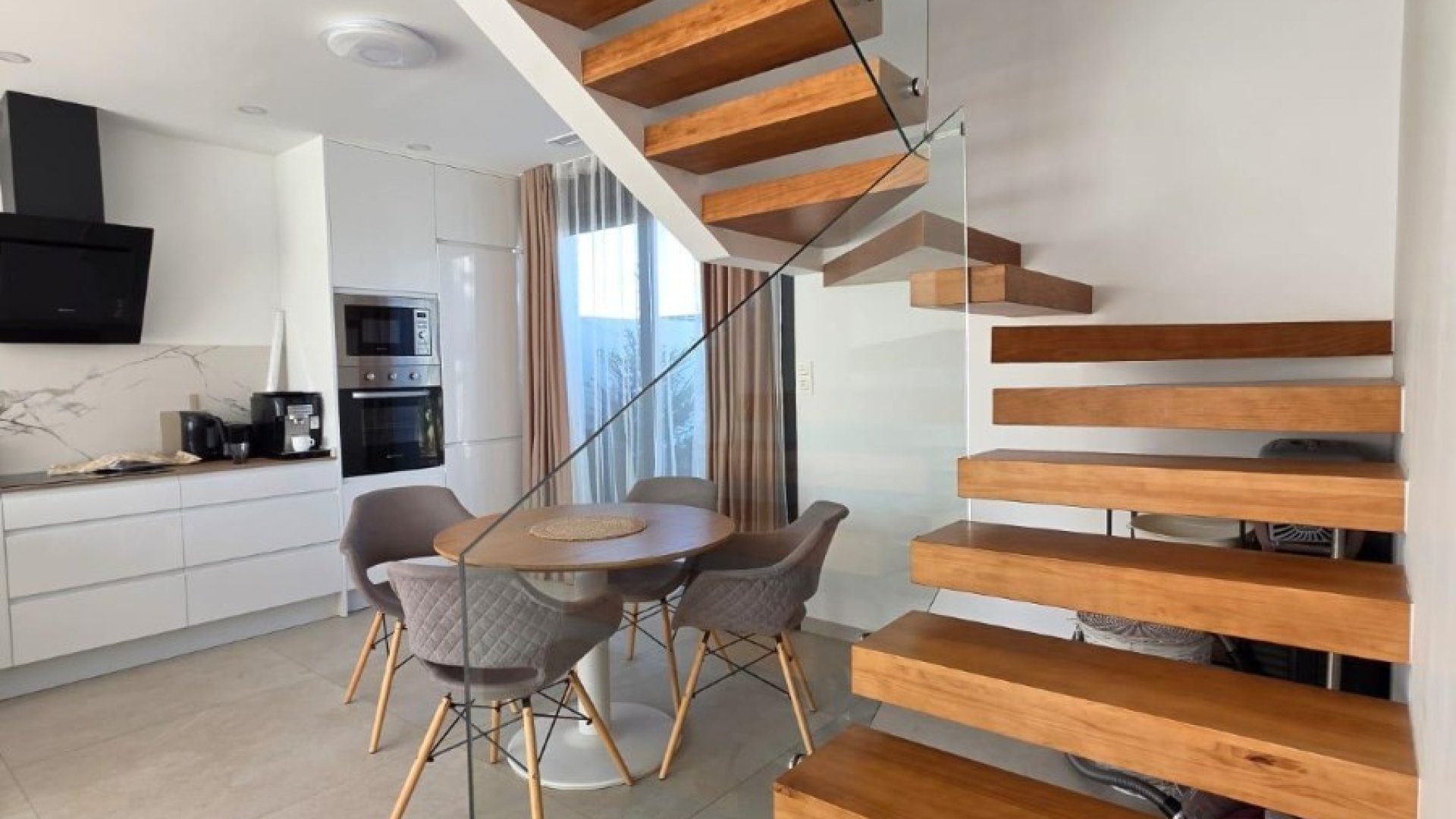 The upper floor houses two double bedrooms with built-in wardrobes and an elegant bathroom with a walk-in shower. From here, you can access a magnificent private solarium, ideal for enjoying the sun, panoramic views, and the privileged Mediterranean climate.