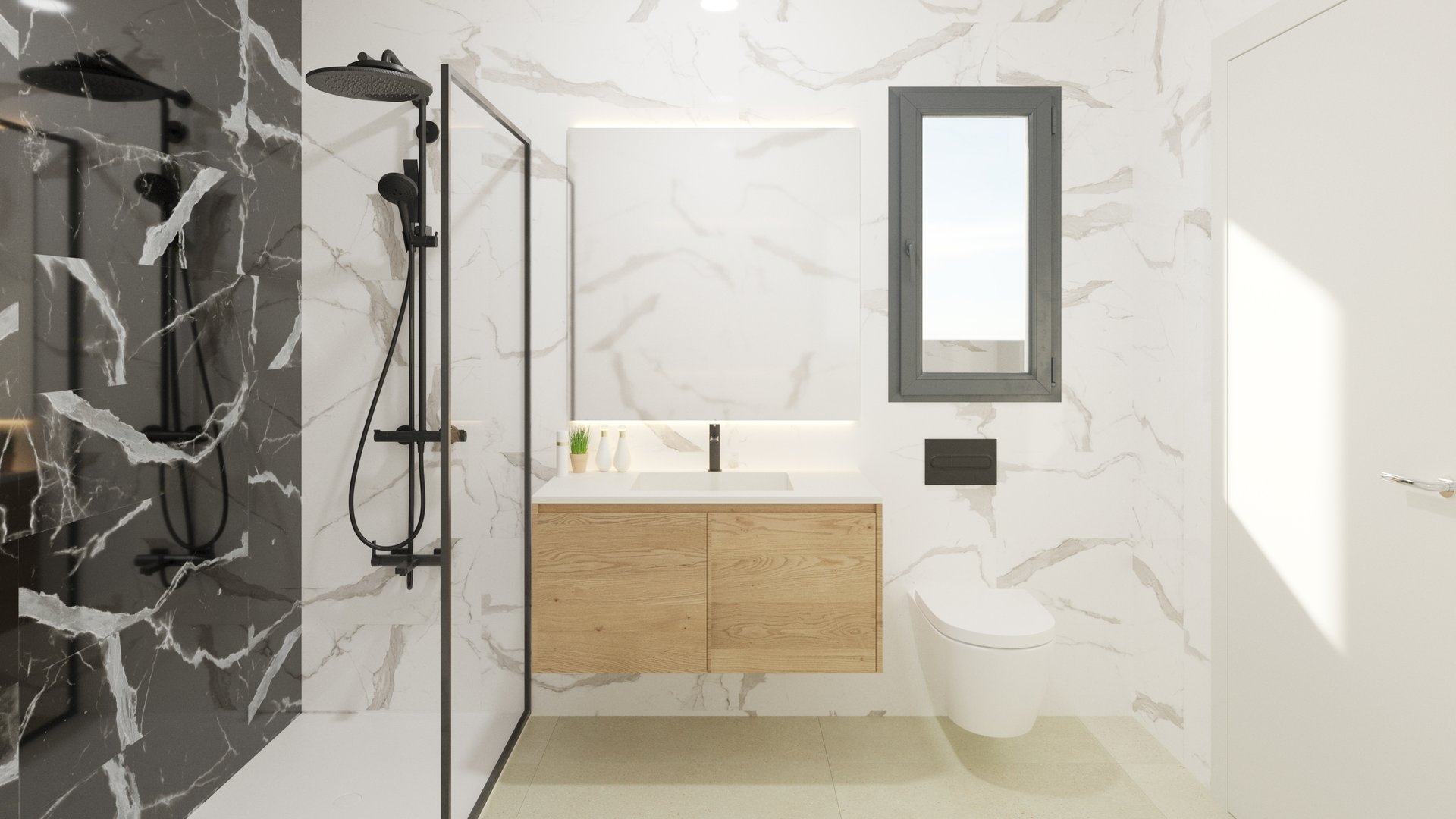 The interior of the house is defined by natural light and a layout designed for well-being. The main floor features a spacious open-plan living-dining room, integrated with the modern and functional kitchen. The large windows not only flood every corner with light, but also visually connect the interior with the outside environment. The house has three spacious and well-distributed bedrooms, ideal for both families and guests. Two contemporary-style bathrooms, equipped with quality materials, complete the sleeping area, offering comfort and design in every detail.