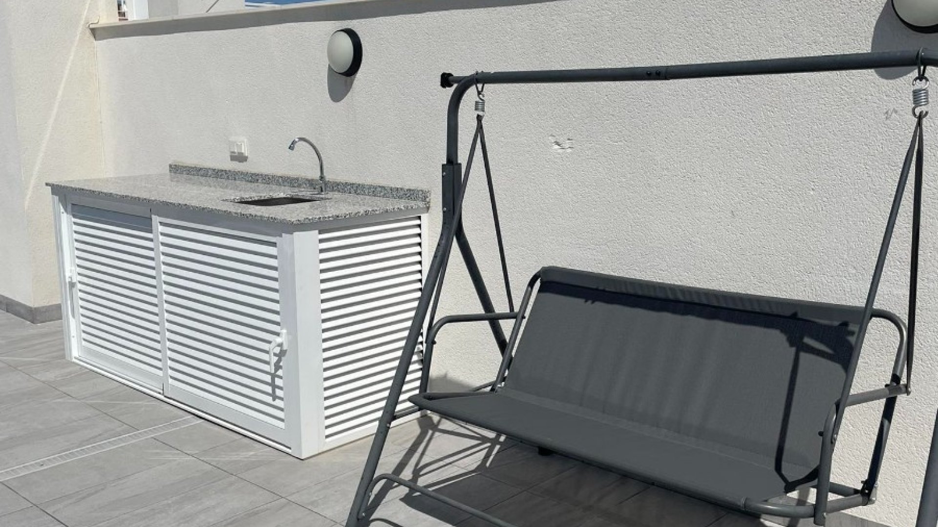 In your search for a recent appartment, don't miss a visit to this stunning penthouse! The bright apartment with its American open kitchen, complete with all amenities, makes it an ideal place for cooking and entertaining. The views of the beautiful garden and communal pool are definitely a plus.The terrace and large solarium, equipped with an aluminium lounge set, sun loungers and a canvas pergola, are perfect for soaking up the sun and relaxing outdoors.After a day in the sun, it is blissful to sleep in one of the two bedrooms, one of which has an en suite bathroom. With a private garage and basement, there is plenty of parking and extra storage space available. Proximity to Villamartin Plaza and golf courses also adds a lot of value to the location. It really does sound like a luxurious and relaxed lifestyle! If you want your own place here on the Costa Blanca this summer, don't hesitate any longer. All you need to bring is your good mood, as the sun is already there and the apparmement is being sold fully furnished.