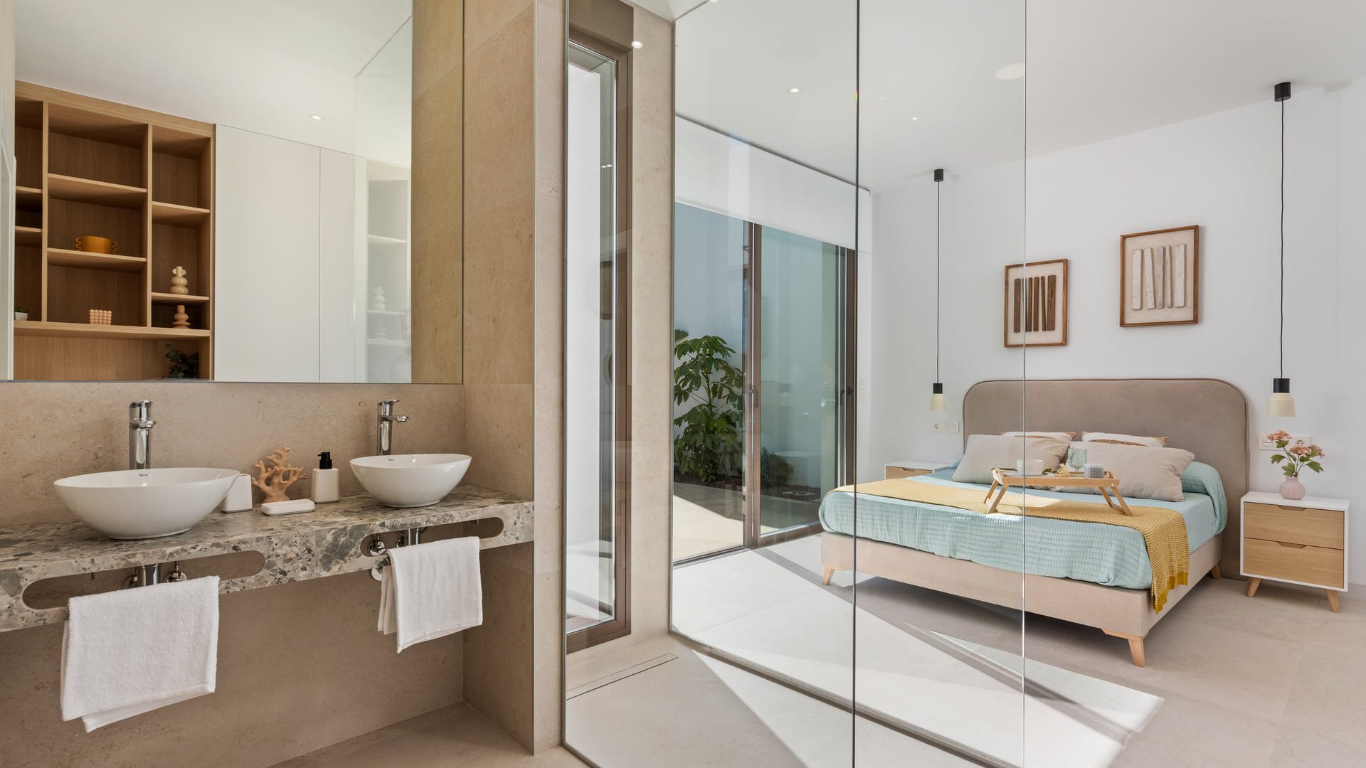 The exterior design of these independent homes in Los Alcázares stands out for its elegance and modernity. Each property features a private pool, ideal for enjoying sunny days in the privacy of your home. Solarium options, available depending on the typology, offer additional space to relax and enjoy the views. Electric shutters add a touch of convenience and security, allowing easy control of light and privacy. The location of the homes, just 1 km from the sea, allows for pleasant walks and outdoor activities in an unparalleled natural setting.