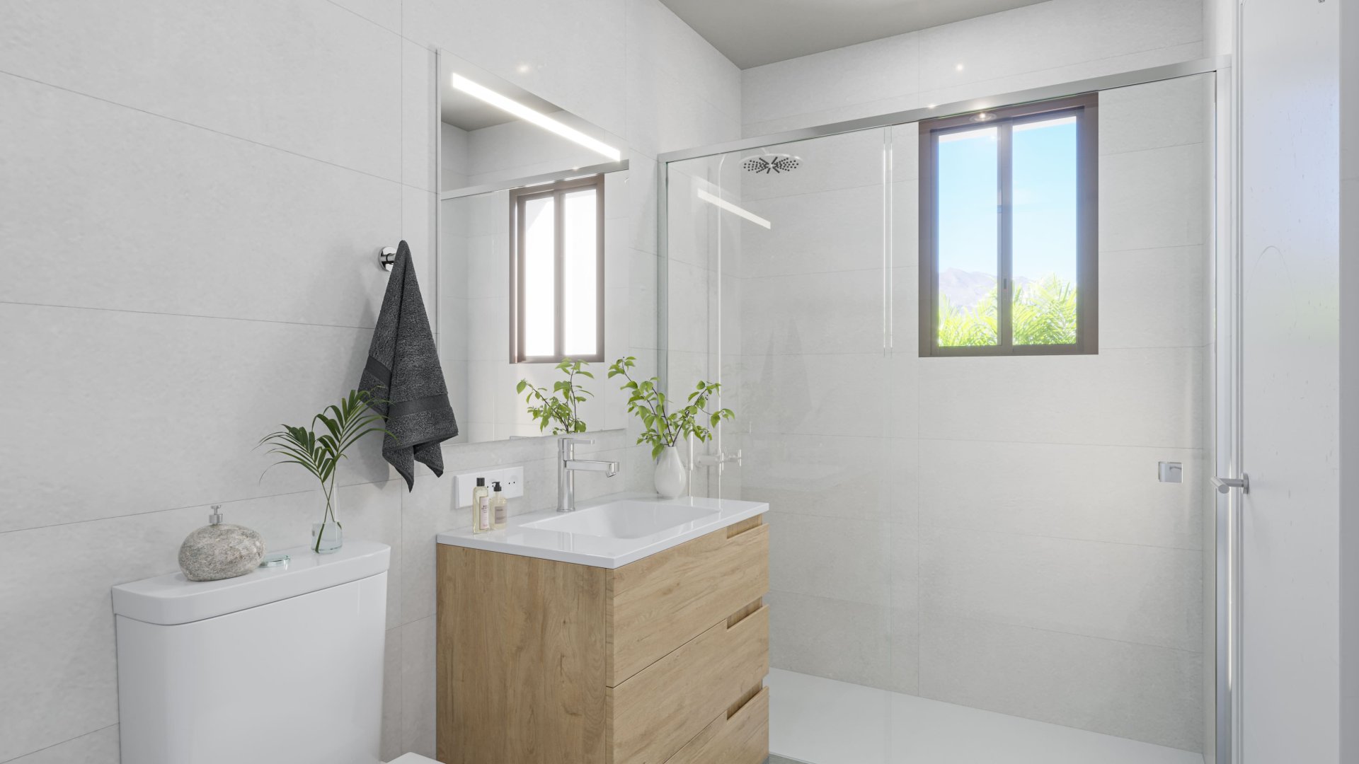 The interior of the townhouses is designed to offer comfort and functionality. Each home has three bedrooms and two bathrooms, providing adequate space for families. The built-in wardrobes in the bedrooms optimize storage, while the pre-installation of air conditioning ensures a pleasant environment throughout the year. The porcelain tile flooring adds a touch of elegance and facilitates maintenance. Additionally, some homes include a jacuzzi, offering extra comfort and luxury.