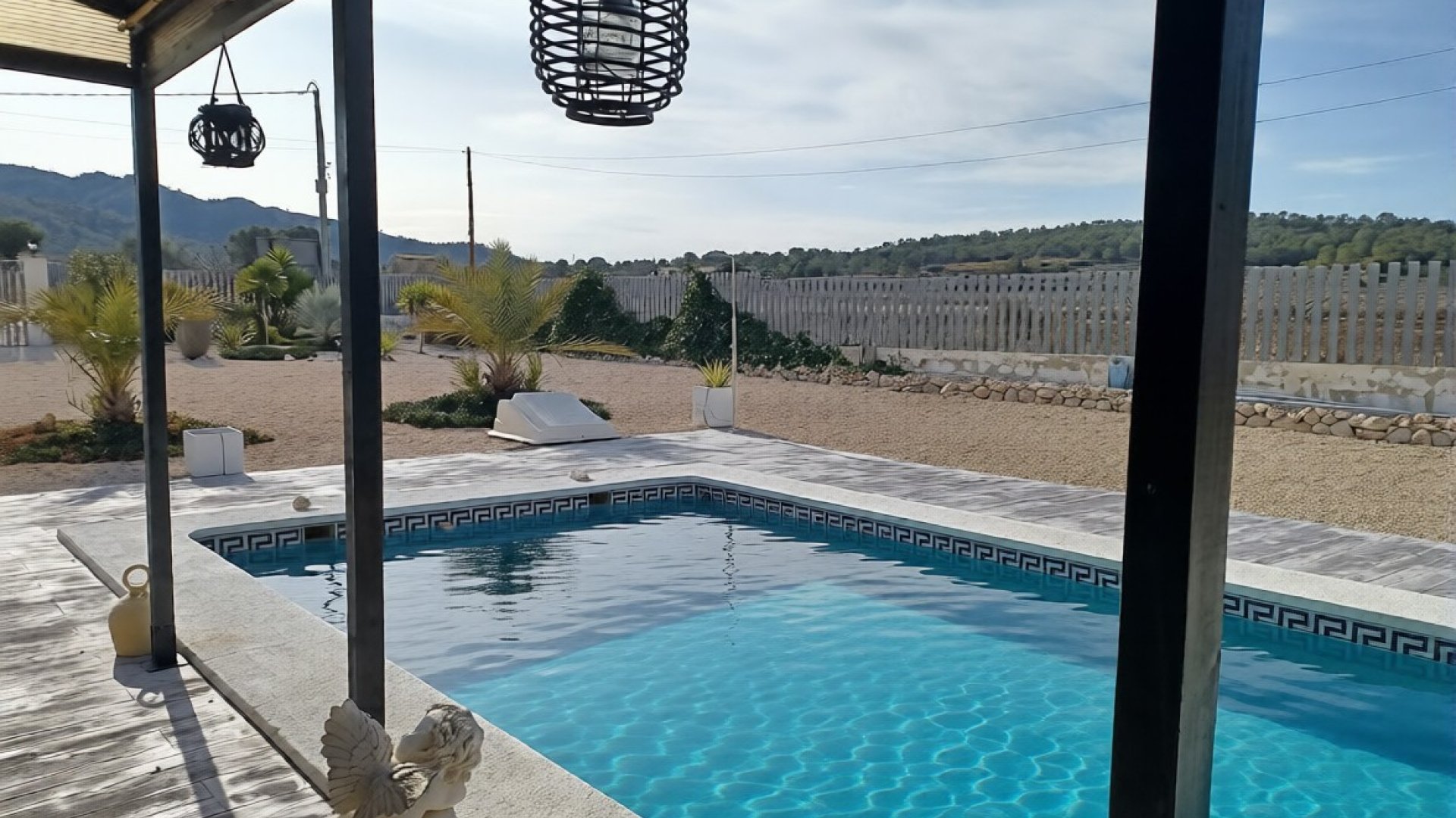 The property features electric entrance gates that open onto a spacious gravelled parking area. At the front of the house, there is a stunning 8 x 4 metre swimming pool surrounded by a generous partially covered terrace, ideal for relaxing and entertaining.