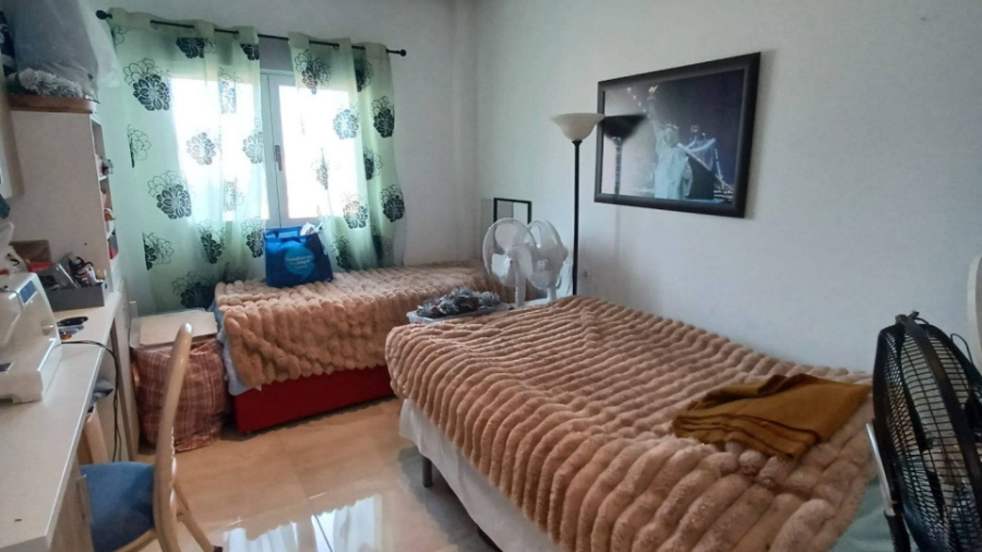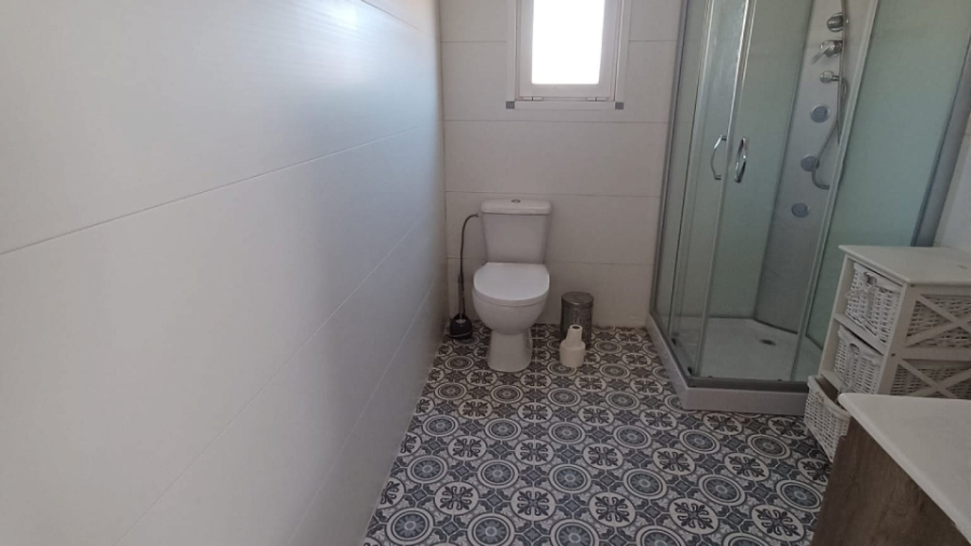 At the end of the hallway is the family bathroom, equipped with a large walk-in shower, WC, and double sinks. Opposite is a double bedroom with doors opening directly onto the front terrace and pool area. The second bedroom is also a double and enjoys side views of the property. The master bedroom benefits from direct access to the front terrace and pool, an en-suite shower room, and a spacious walk-in wardrobe with built-in sliding doors to maximise space. This room is fitted with independent air conditioning (hot and cold).