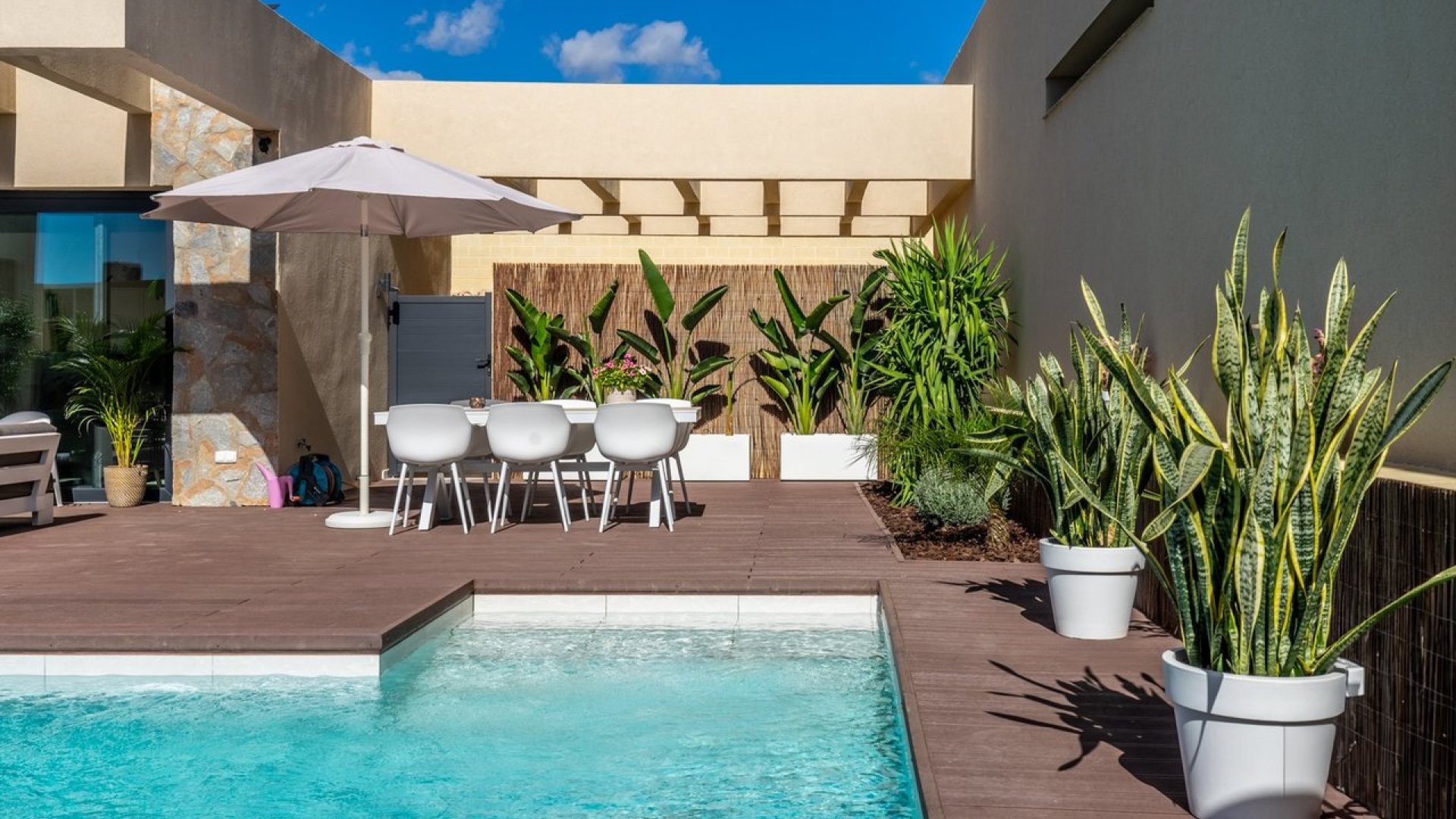 Discover the Spirit Villa at Las Vistas – Altaona Golf and Country Village KEY READY VILLA, recently finished construction. Welcome to the Spirit Villa, a luxurious two-bedroom, 2.5-bathroom home situated within the exclusive Las Vistas community, part of Altaona Golf and Country Village. Las Vistas is an innovative residential project comprising 90 unique villas, divided into three phases. Each villa is designed to blend harmoniously with its natural surroundings, nestled at the foot of the mountain. This villa offers a distinctive design both inside and out, featuring modern, innovative architecture that perfectly complements the environment. The spacious interior is thoughtfully crafted to provide comfort and style, while the extensive private garden and swimming pool create an oasis for relaxation and enjoyment. This villa offers you quite a large garden, parking space and swimming pool, and has been upgraded with quite some extras from the standard model, for over €40,000. Such as: • Upgraded Italian kitchen layout with high-end brand appliances: American fridge, Whirlpool dishwasher, Whirlpool combi microwave, extraction hood, Bora induction hob, Klarstein 32-bottle wine fridge and Quooker with 7-litre boiler, professional Jura coffee/cappuccino machine • Extra built-in wardrobe in entrance • Living room and master bedroom have been enlarged • Enlarged living room by 50 cm • Built-in Grohe rain showers with push buttons in both bathrooms • Built-in faucet in master bathroom and upgraded sink • Bathrooms and guest toilet with partial glass mosaic • Both shower areas in Mortex (instead of tiles) • Glass skylight openable window in master bathroom • All 3 toilets have integrated bidet function and extra hand shower • Additional large window in master bedroom • Master bedroom exterior atrium integrated into the bedroom with separation wall for more interior space, creating a vanity area • Sliding doors in each bedroom to gain direct access to the garden/pool area • Airzone: Zoned AC (each room can adjust temperature and be controlled independently) • Underfloor heating in living room, kitchen and bathrooms • Lightweight thin interior bamboo shutters in all rooms • Mosquito nets in all rooms • Extra dimmers in all rooms • Threshold-free waterproof laminate flooring throughout the villa • Central water filter system by 3M – potable water throughout • Garden and carport lighting • Larger garden than other villas • Extra 100 m² composite decking terrace and 75 m² artificial grass • 35 m of brown twig mats to create a more atmospheric environment • Enlarged swimming pool from 3x6 m to 4x7 m with side entrance and steps • Maintenance-free garden shed (2.15 x 2.15 m) • Inflatable round 4-person Intex jacuzzi • 2 security cameras with phone app If you're looking for a home that combines cutting-edge design with a natural setting, this Spirit Villa at Las Vistas is the perfect choice.
