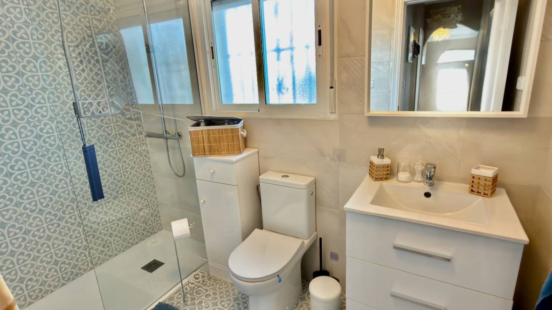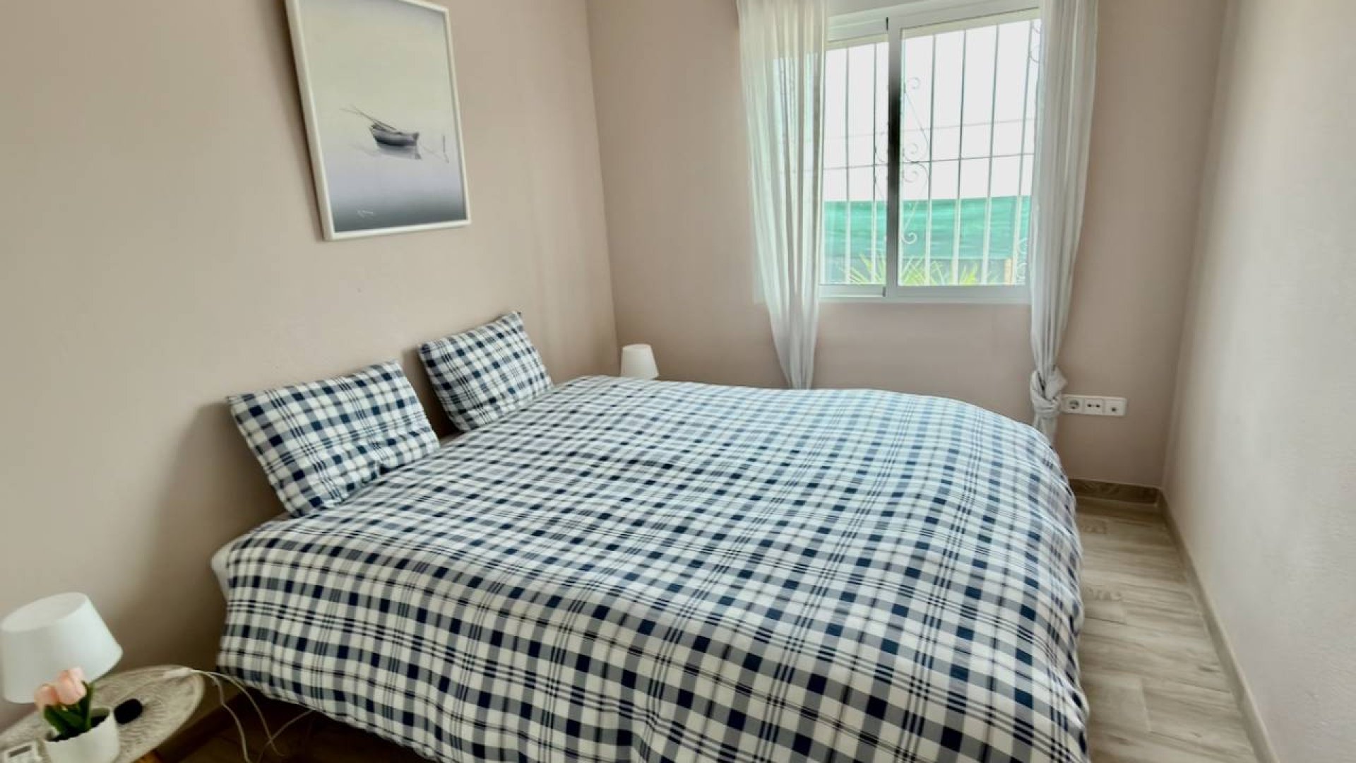The villa features three spacious bedrooms, all with built-in wardrobes, including a beautifully appointed master suite with en-suite bathroom, offering privacy and comfort.
