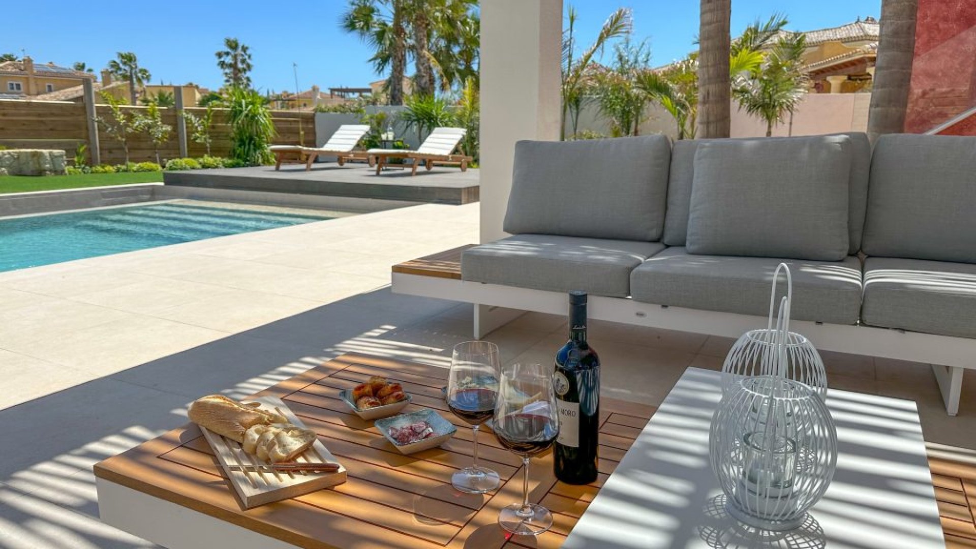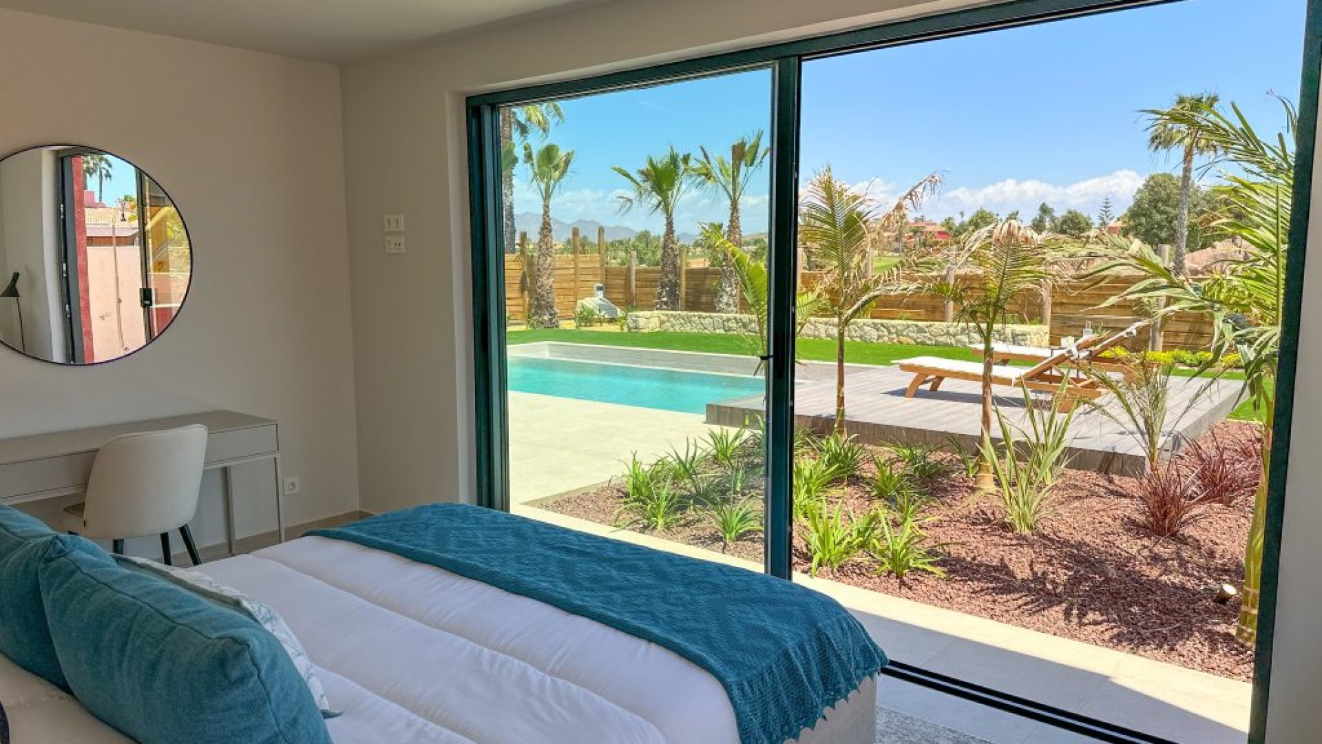 El exterior de estas villas ha sido cuidadosamente diseñado para ofrecer la máxima comodidad y privacidad, con una combinación de materiales naturales y detalles modernos: Piscina privada de 8m x 4m con acceso directo desde la terraza. Amplias terrazas y solárium privado para disfrutar de las vistas al campo de golf y las montañas. Jardín privado con césped natural, zonas de sombra y vegetación autóctona. Barbacoa de obra integrada en la terraza para disfrutar de reuniones al aire libre. Porche cubierto que conecta directamente con el salón para crear un espacio abierto y continuo. Patio delantero vallado que ofrece privacidad y un acceso seguro a la vivienda. Amplias zonas de aparcamiento privado para varios vehículos. Las líneas arquitectónicas limpias y el uso de materiales naturales crean una estética elegante que se integra perfectamente con el entorno natural del resort.