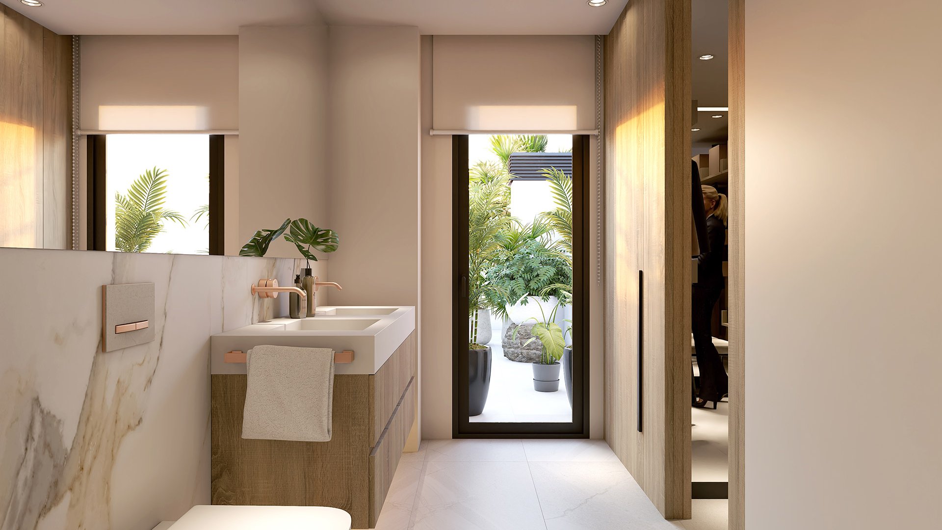 El interior de las villas está diseñado para ofrecer el máximo confort y estilo. Cada villa dispone de tres dormitorios y cuatro baños, asegurando espacio y privacidad para todos los miembros de la familia. Las villas están equipadas con aire acondicionado, garantizando un ambiente agradable durante todo el año. Las persianas eléctricas y los armarios empotrados son características estándar que aportan comodidad y funcionalidad. Además, cada villa incluye un garaje, proporcionando un espacio seguro para el estacionamiento. El solárium es un espacio adicional que permite disfrutar de las vistas y del sol en un entorno privado.