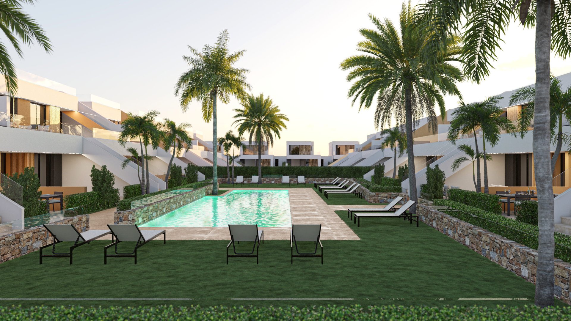 El interior de los bungalows está cuidadosamente diseñado para ofrecer un espacio habitable funcional y acogedor. Con una distribución que incluye dos dormitorios y dos baños, cada hogar está pensado para proporcionar comodidad y privacidad. Los armarios empotrados en los dormitorios ofrecen soluciones de almacenamiento eficientes, mientras que la preinstalación de aire acondicionado permite mantener una temperatura agradable durante todo el año. La inclusión de electrodomésticos modernos en la cocina facilita las tareas diarias, haciendo de estos bungalows una opción ideal para quienes buscan un hogar listo para habitar.