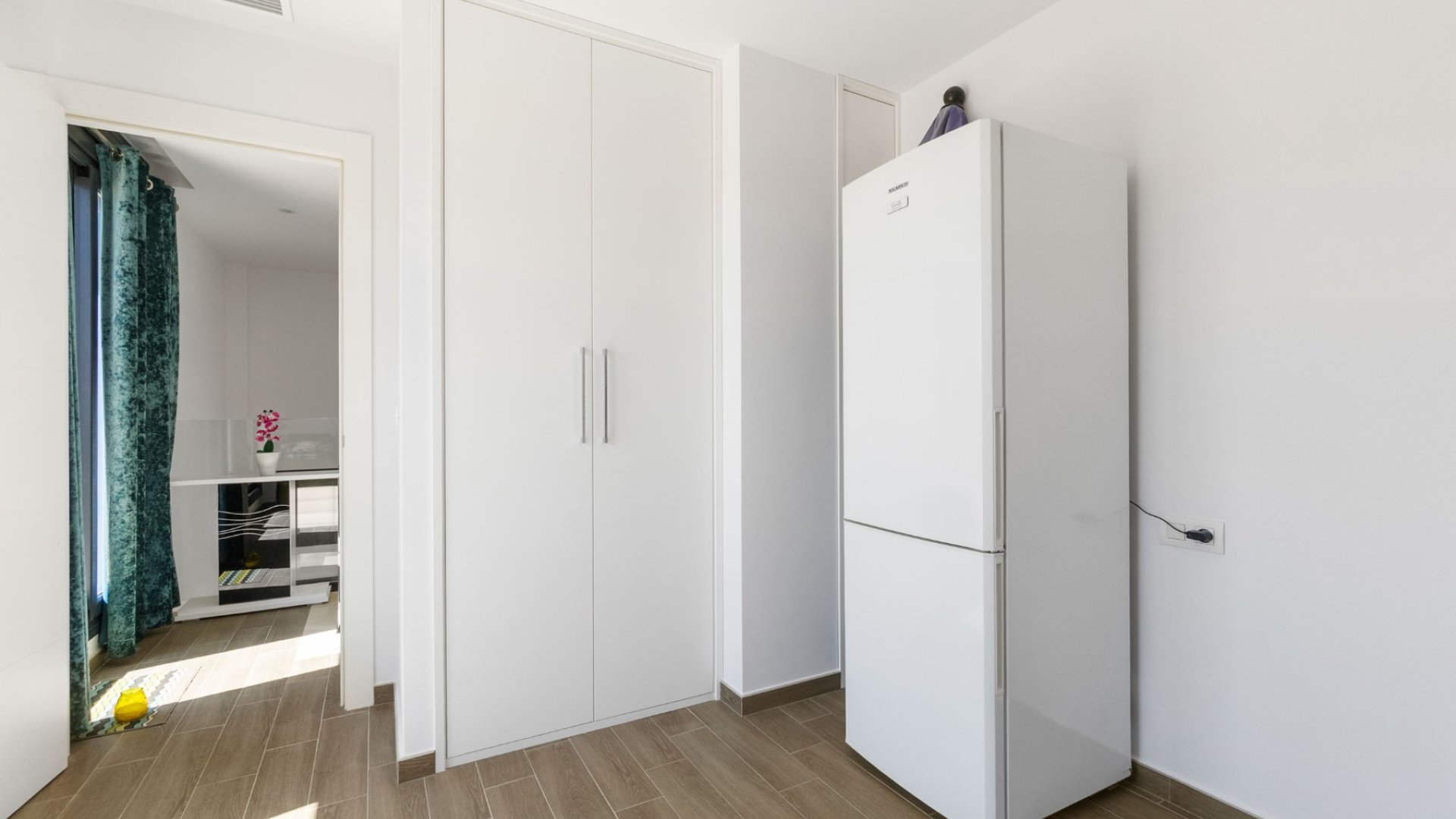 L'étage supérieur abrite deux chambres supplémentaires avec placards intégrés , une salle de bain complète avec douche et une grande terrasse , d'où un escalier mène à un solarium privé spectaculaire offrant une vue imprenable sur Torrevieja et le lac salé , un espace idéal pour se détendre ou profiter de réunions en plein air.