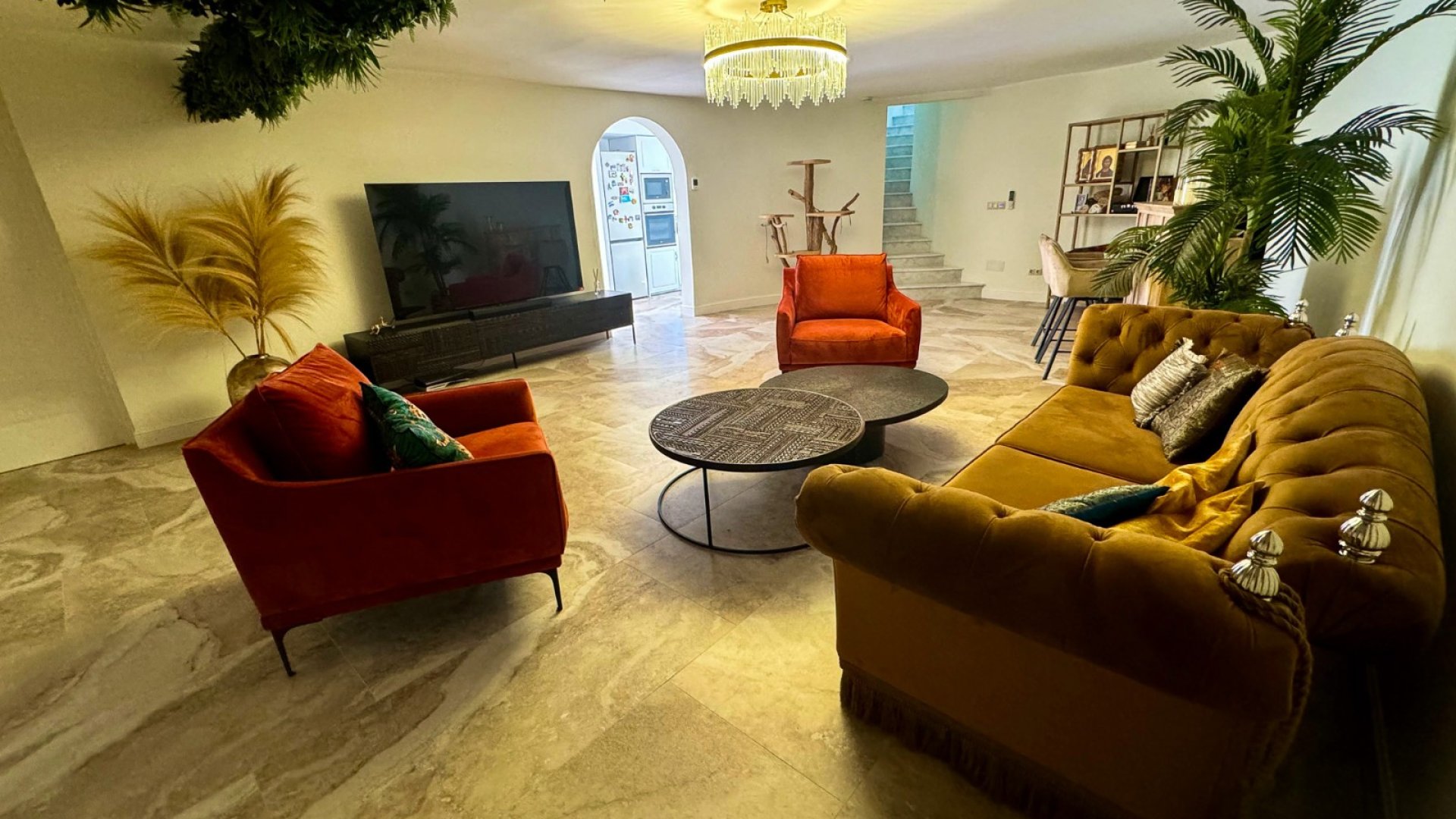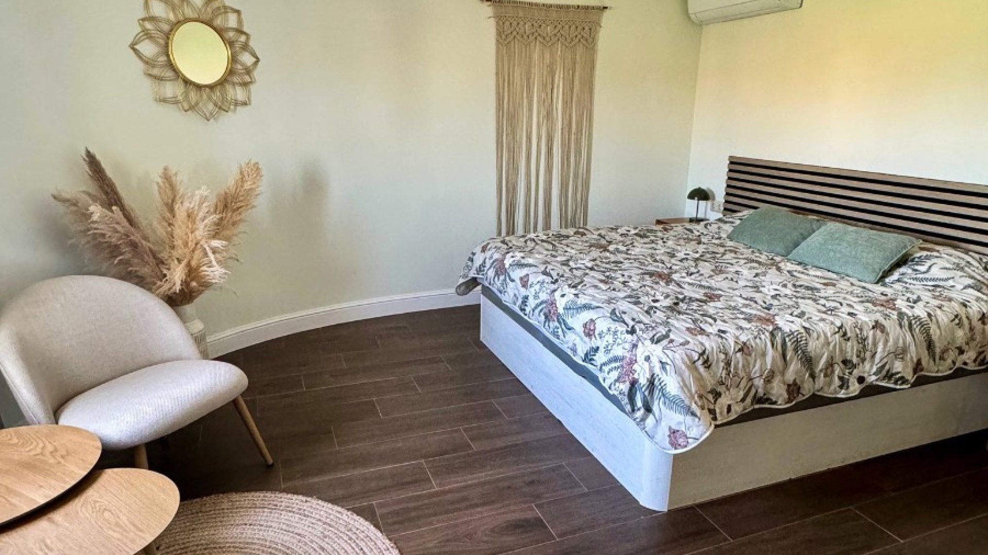 À l'extérieur, la villa dispose d'une piscine privée chauffée entourée d'une pelouse synthétique haut de gamme et d'un magnifique jardin paysager agrémenté d'arbres fruitiers tels que des bananiers, des grenadiers et des figuiers , créant une ambiance méditerranéenne à la fois relaxante et élégante. Un parking privé est également inclus.