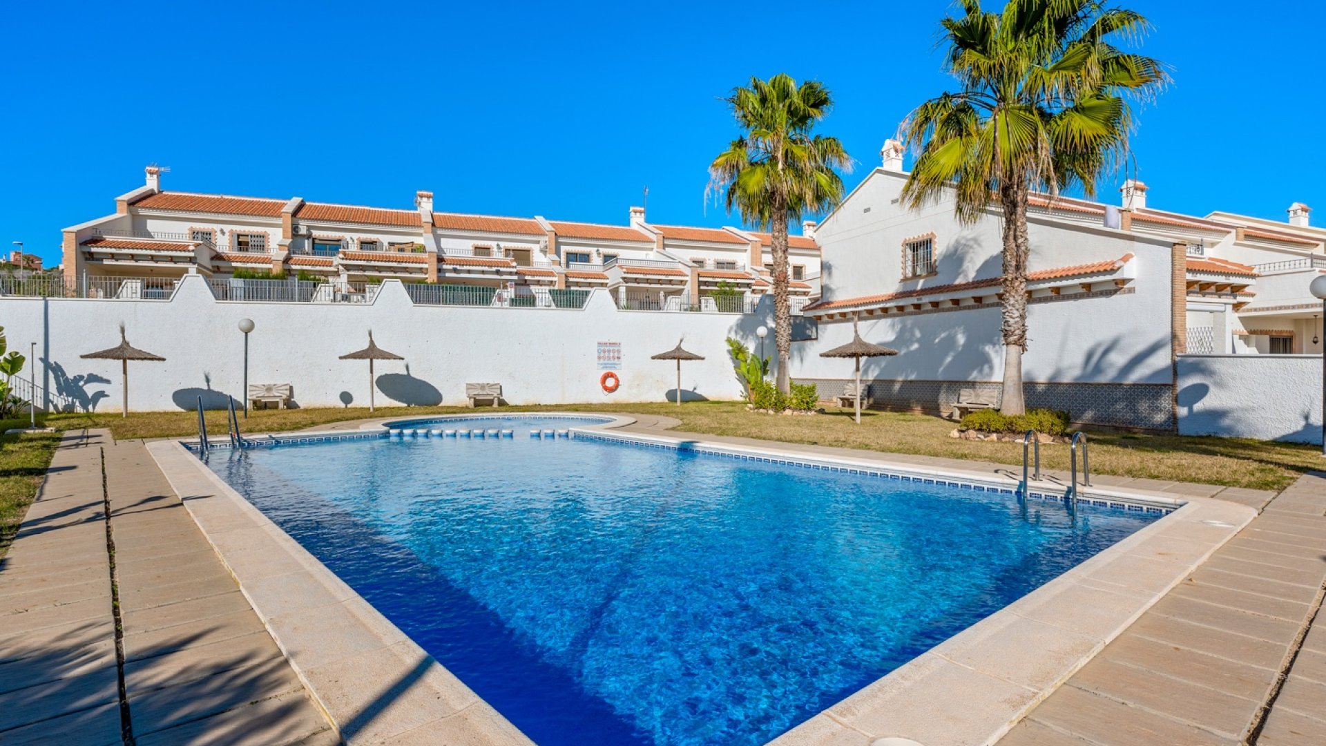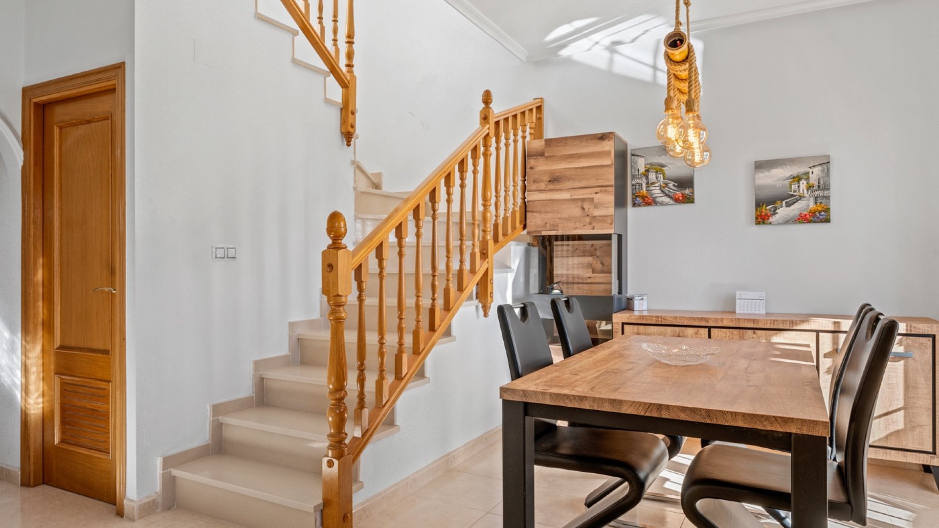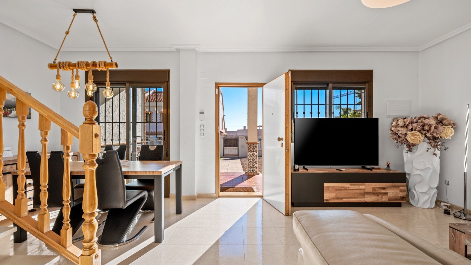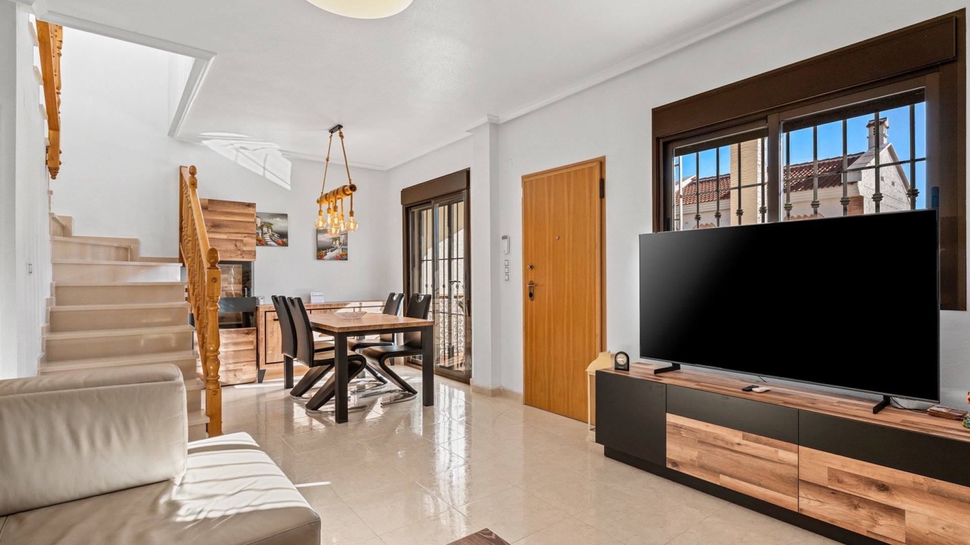 Charmante maison de ville avec jardin à Villas María – San Miguel de Salinas Cette maison de ville, en parfait état, comprend 3 chambres et 3 salles de bains et se situe dans le charmant complexe résidentiel Villas María à San Miguel de Salinas. C'est le logement idéal pour ceux qui recherchent un confort optimal sous le soleil espagnol, que ce soit pour y vivre à l'année ou pour les vacances. La maison est agencée de façon pratique et bien pensée. Au rez-de-chaussée, vous trouverez une chambre et une salle de bains, idéales pour les invités ou pour ceux qui préfèrent un logement de plain-pied. La cuisine séparée et entièrement équipée s'ouvre sur une terrasse attenante, parfaite pour prendre le petit-déjeuner au soleil. Le vaste espace de vie ouvert, comprenant salon et salle à manger, bénéficie d'une abondante lumière naturelle et s'ouvre sur un agréable jardin exposé sud-est, un endroit merveilleux pour profiter de la vie en plein air toute l'année. Il y a un grand parking souterrain sous la maison avec : une place de parking privée un local de rangement spacieux d'environ 15 m² La maison fait partie d'une urbanisation agréable et bien entretenue et se situe à seulement 2 km du centre du village , où vous trouverez toutes les commodités telles que des commerces, des restaurants, des écoles, une pharmacie et des terrasses accueillantes. San Miguel de Salinas est un charmant village espagnol authentique situé au sud de la Costa Blanca. Bénéficiant d'une situation légèrement surélevée entre les lagunes salées de Torrevieja et la mer Méditerranée, il offre des vues imprenables et un microclimat sain. Ce qui rend cet endroit si attrayant : À seulement 15 minutes en voiture des plages d'Orihuela Costa À proximité de plusieurs terrains de golf renommés tels que Las Colinas, Campoamor et Villamartín Bonnes liaisons avec les aéroports d'Alicante et de Murcie Un quartier résidentiel calme avec des résidents internationaux Marché hebdomadaire et place de village animée à l'ambiance locale San Miguel allie tranquillité et nature à une excellente accessibilité et à toutes les commodités à proximité immédiate — un lieu idéal pour ceux qui souhaitent découvrir l'Espagne authentique sans sacrifier leur confort. Communauté / VVE : 52 € / an Taxe foncière (Suma) : 350 €/an